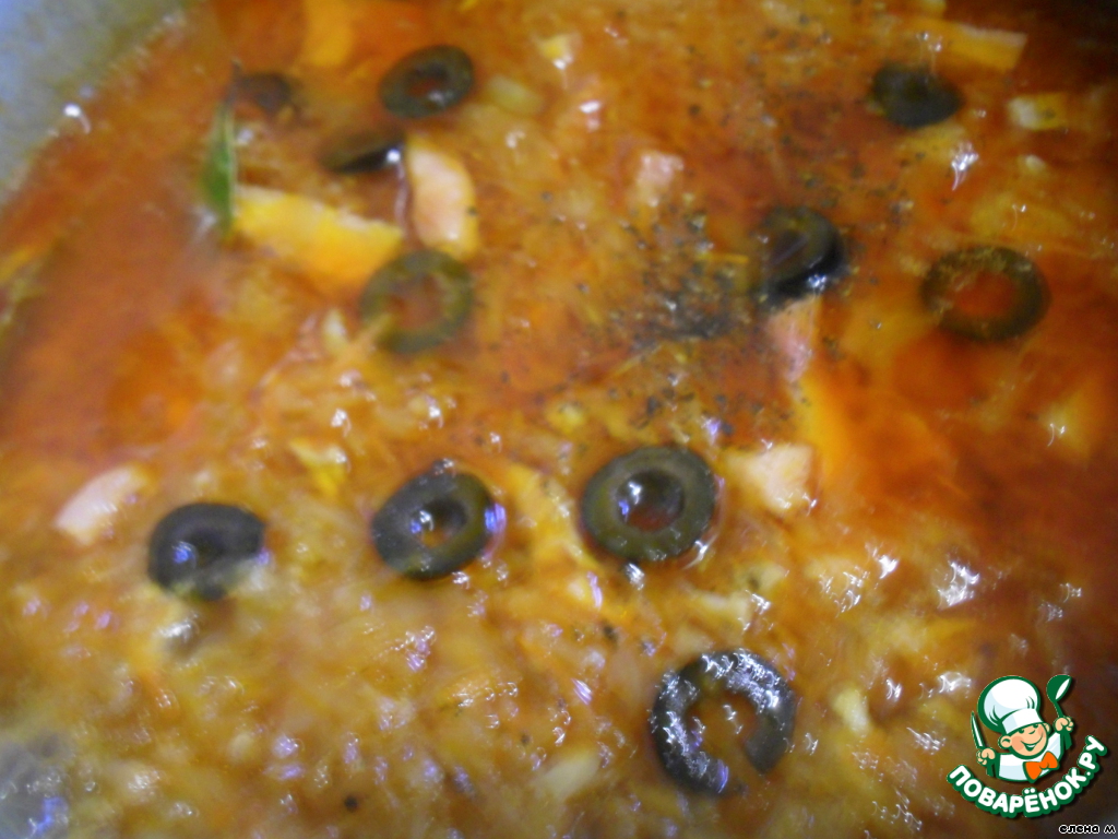 Посолить, добавить перец, лавровый лист, маслины, нарезанные колечками. Варить 5 минут. Снять с огня.
