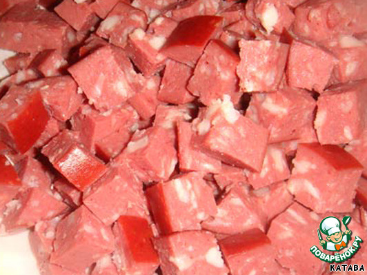 Как только лук начинает подрумяниваться, выкладываем нарезанные колбаску, морковь и огурцы. Жарим не долго, не забываем помешивать. Главное, чтобы овощи сохранили свой цвет.