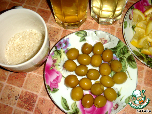Рис (горсть) промыть, слить рассолы с огурцов и с оливок, лимон порезать треугольничками.