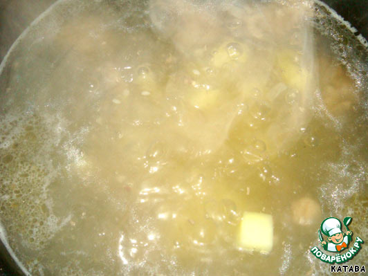 В кастрюлю добаляем картофель, затем рис, варим до полуготовности.