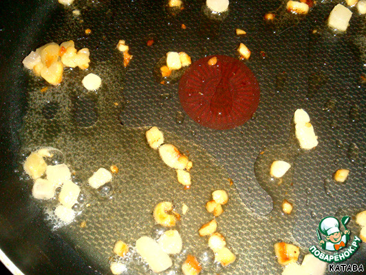 Тем временем нарезаем мелко-мелко кусочек копченого сальца и бросаем растапливаться на сковороду.