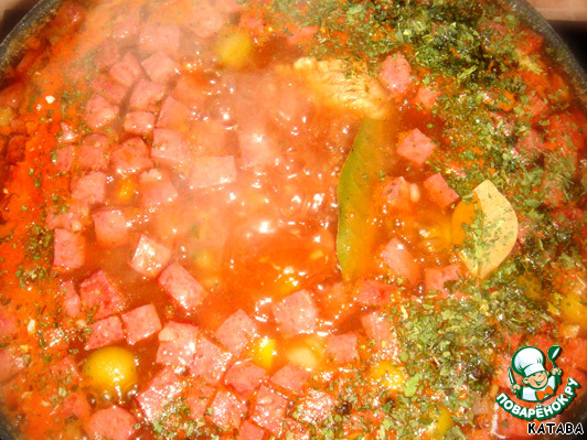 В кастрюлю выкладываем овощи с колбасой, варим минут 5.