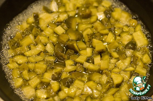 В кастрюлю кладем мясной набор, пассированный лук и томат, припущенные огурцы, оливки, каперсы, лавровый лист, перец, соль и заливаем бульоном. Варим 10 минут на слабом огне, затем настаиваем минут 15.