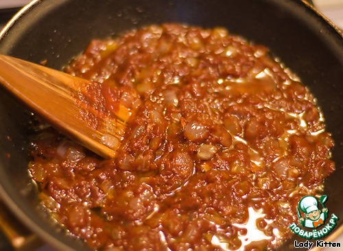 Мелко нарезанный лук пассируем на растительном масле вместе с томатом.