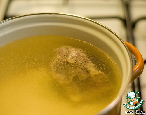 Варим мясокостный бульон. Процеживаем. Мясо охлаждаем в части бульона.