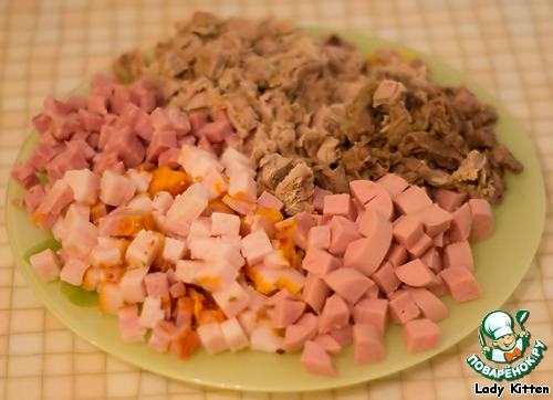 Вареные говядину и свинину, балык, ветчину и сосиски нарезаем мелкими кубиками.
