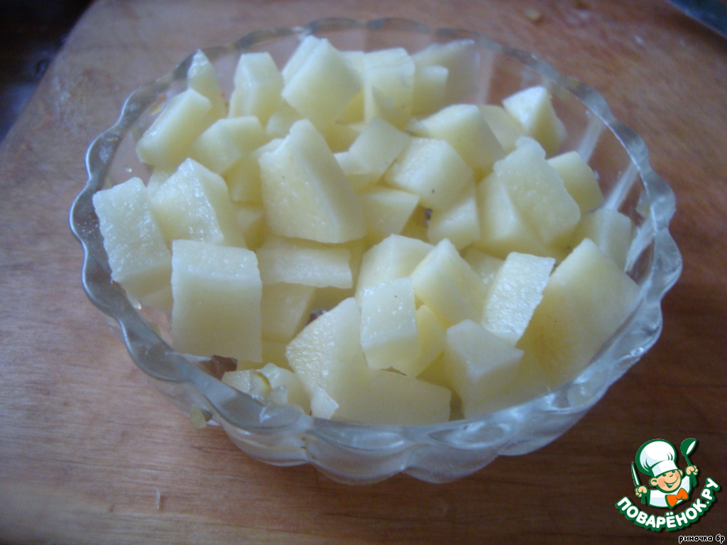 Режем картофель вот в такое маленькое блюдечко (это примерно 50-60 г)