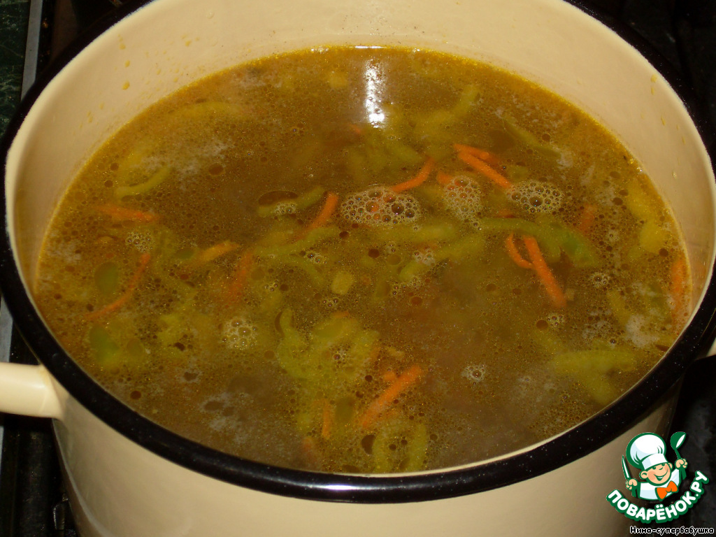 В кипящий бульон опустить картофель, когда бульон снова закипит, добавить зажарку и сердечки. Варить на маленьком огне минут 10.