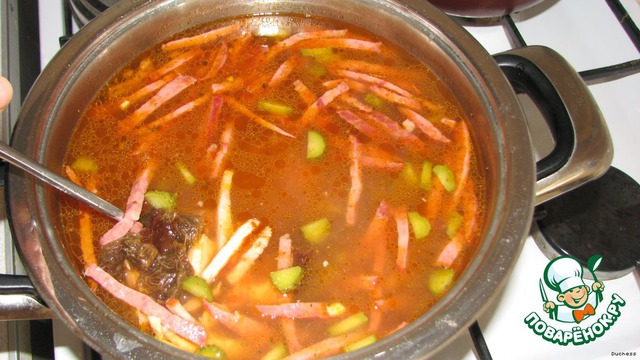 Ингредиенты даны на 3 -х литровую кастрюлю. Итак, заливаем в кастрюлю воды и кладем обмытую грудку (или 2, если маленькие) вариться. Перед закипанием воды обязательно снимаем пенку, чтобы бульон был прозрачный. Солим, добавляем специи (как для мяса, я беру на рынке россыпью) и кетчуп. Оставляем вариться на 15 минут. В это время нарезаем соломкой сервелат и карбонад. Огурчики я режу пополам вдоль и поперек, получаются полукольца. Чернослив моем, режем пополам или на 4 части. Лимон нарезаем тоненькими полукруглыми дольками. В это время курица уже готова. Вынимаем ее из кастрюли и режем кубиками 1 см на 1 см. Возвращаем ее обратно в кастрюлю, добавляем нарезанный сервелат и карбонад. Оставляем на небольшом огне на 5 -7 минут. После чего огонь выключаем и добавляем огурчики и чернослив. Еще через 5 минут можно подавать на стол. Перед подачей добавляем оливки, лимон и сметану (или майонез, кому как нравится).