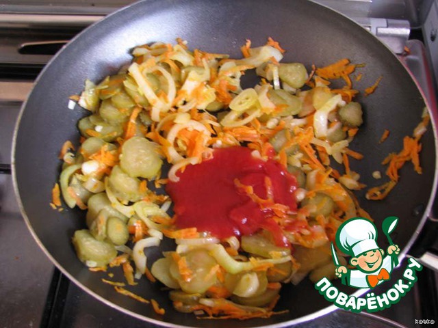 Лук и морковь поджарить на сильном огне на подсолнечном масле. Когда масса станет золотистой, заложить соленые огурцы, потомить на слабом огне под крышкой 2-3 минуты. Затем заложить столовую ложку томатной пасты, все перемешать, потомить под крышкой еще 3 минуты.