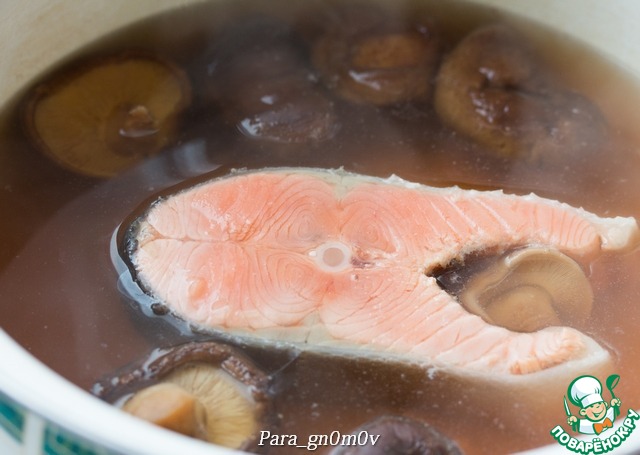 6. Семгу очистить от чешуи и опустить в бульон. Варить на небольшом огне.
