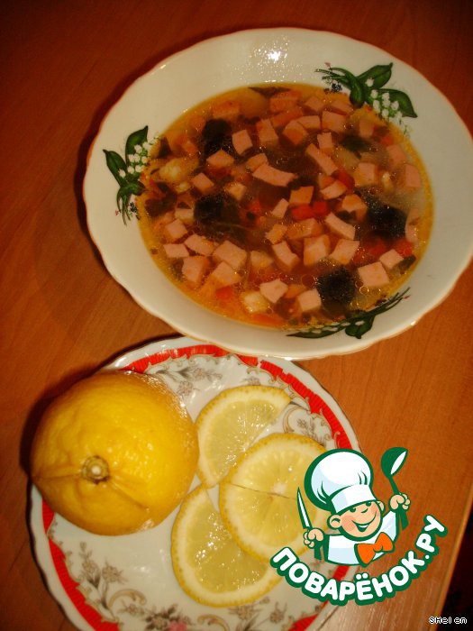 Прокипятим еще раз все в течение 5 минуток и наш суп-шедевр готов!!! При подаче на стол, я режу лимончик и каждый добавляет его по вкусу. С лимоном очень вкусно, он придает супу кислинку!!! ПРИЯТНОГО ВАМ АППЕТИТА!!!