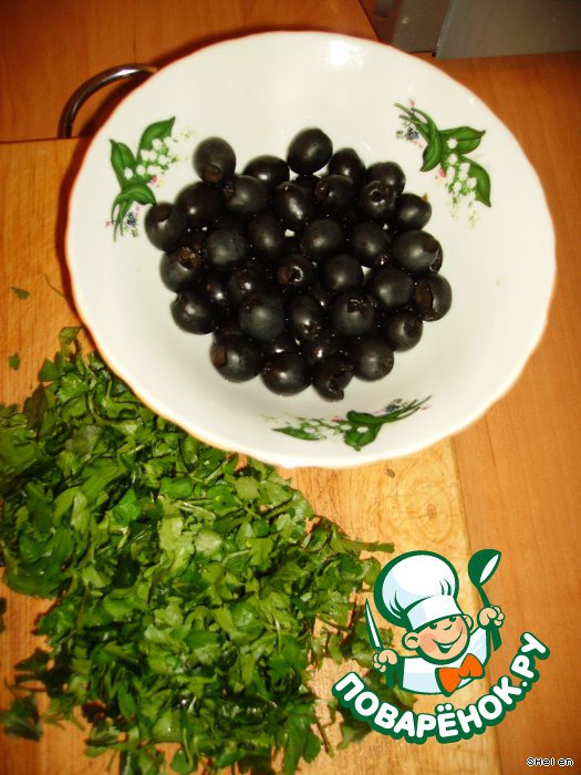 Когда мясо в кастрюле проварилось, достаем его и режем небольшими кусочками. Опускаем нарезанное мясо в кастрюлю. Туда же добавляем содержимое сковороды. Когда все это закипит, добавляем оливки, мелко порубленную зелень (в моем случае это петрушка) и лавровый лист.