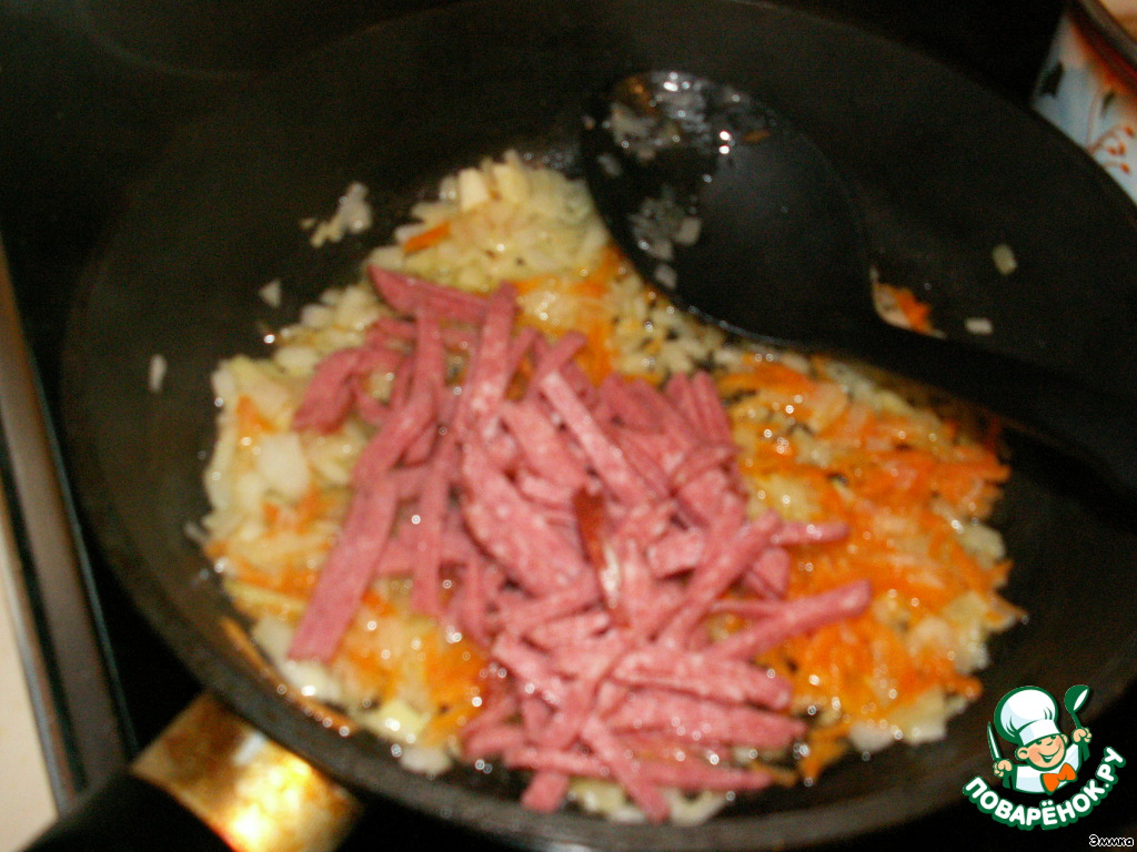 Как только лук начнет приобретать золотистый цвет, добавляем в сковороду сервелат. После того, как обжарится сервелат, добавляем огурцы.