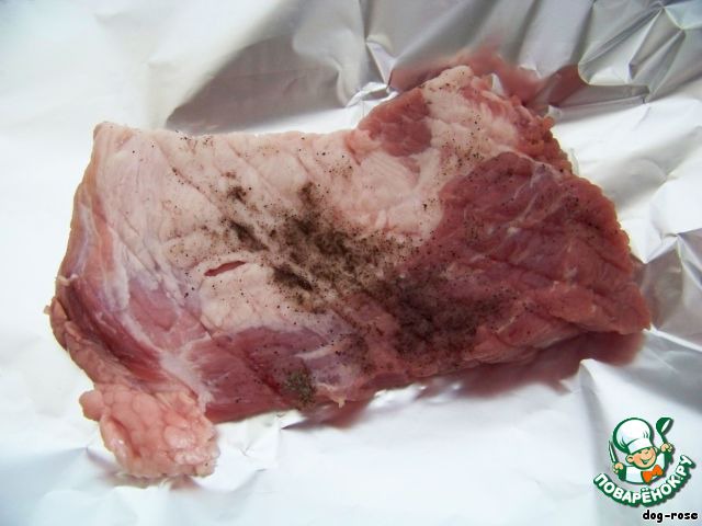 Мясо нарезаем (кусочками примерно по 100г), отбиваем, я отбиваю ножом. Солим, перчим по вкусу. Кладем каждый кусок на фольгу, оставляем большие края, чтобы потом можно было завернуть.