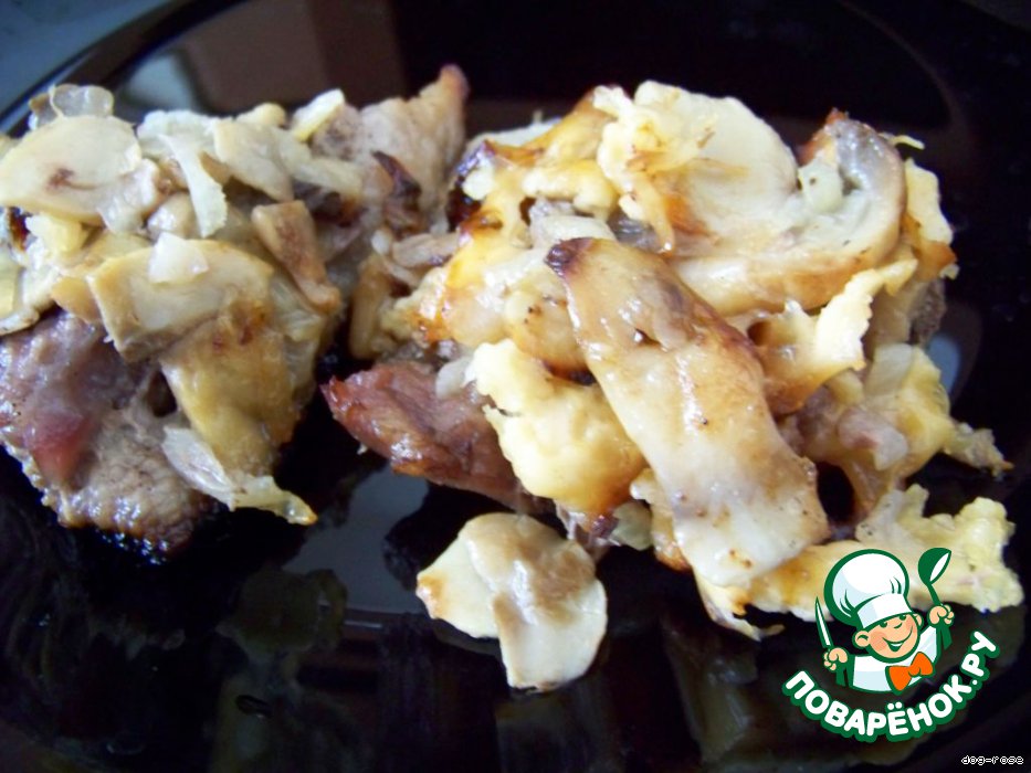 Обжариваем шампиньоны и нарезанный лук, слегка солим. Выкладываем на мясо грибы с луком.