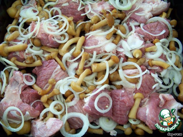 Выкладываем в противень мясо, лук и грибы, предварительно их размораживать нет необходимости. У меня слегка оттаяли, пока лежали и ждали своей очереди.