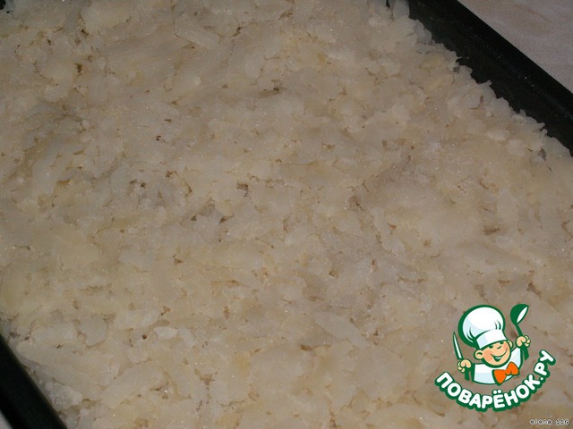 Картофель отварить в мундире до готовности, остудить и натереть на крупной тeрке.