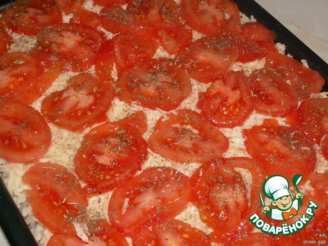 Помидоры залить на несколько минут кипятком, снять кожицу и порезать кружочками.