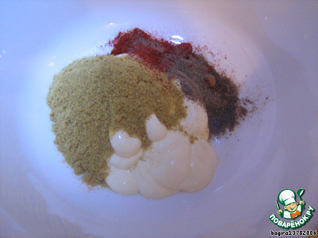 Готовим маринад: смешиваем майонез, горчицу, соль и перец. Здесь я сделала первое отступление от оригинального рецепта: вместо готовой горчицы положила пару ложек сухой, т.к. готовой не было в наличии.