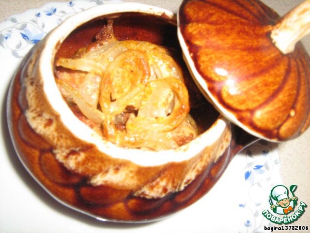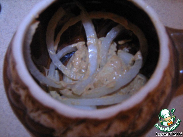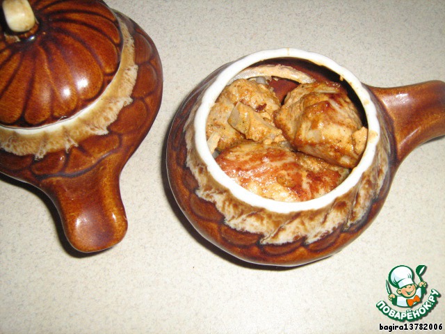 Здесь я позволила себе сделать второе отступление от рецепта. Почему-то идея с тушением мяса мне не очень приглянулась, и я решила запечь его в духовке. В горшочках, которые пылились на полке, и не были еще опробованы в работе.