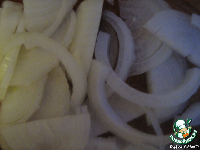 Выкладываем в кастрюльку слои мяса, чередуя их с луком. Оставляем на ночь.