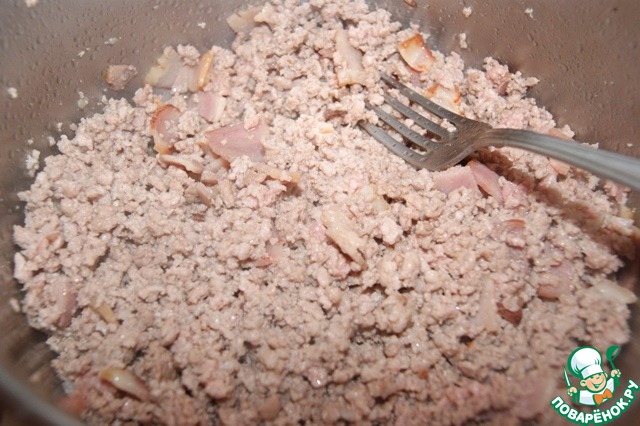 В 1 ст. л. масла обжарить нарезанный кусочками бекон, добавить фарш и, постоянно мешая размять вилкой, тушить до готовности фарша.