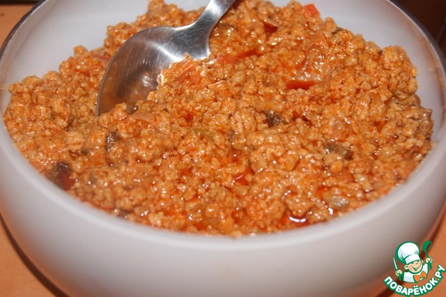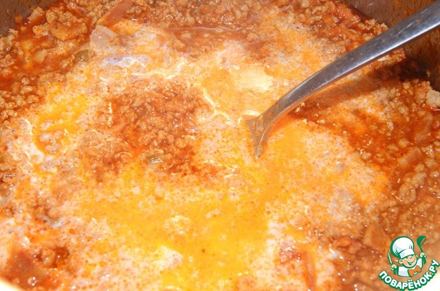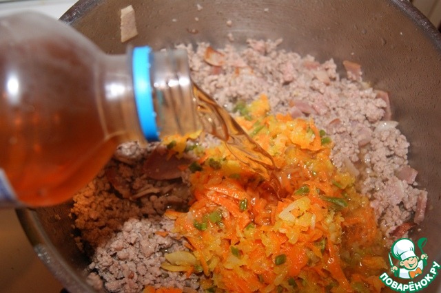 Соединить фарш с овощами и влить вино, тушить 3-5 мин до испарения алкоголя.