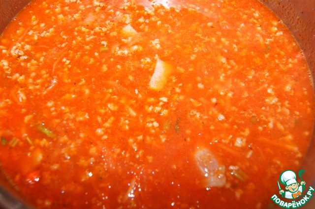 Добавить томатную пасту и 300 мл овощного бульона, перемешать, довести до кипения. Убрать огонь до минимума и тушить 2 часа. Если бульон выкипел до истечения положенного времени, то добавьте его еще, но учтите, что в конце варки он должен выкипеть почти полностью.