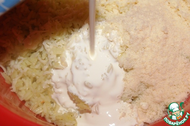 Отварить рис до полуготовности. Слегка остудить. Добавить в него пармезан и сливки, перемешать.