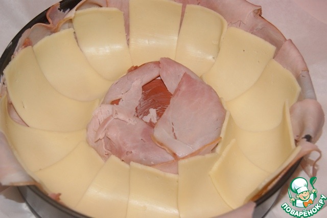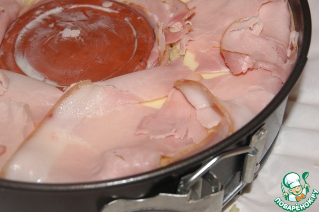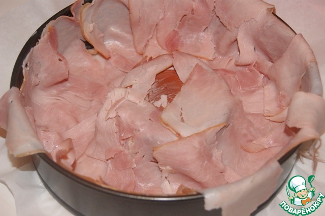 Выстелите форму ветчиной так, чтобы за ее бортики свисали края.