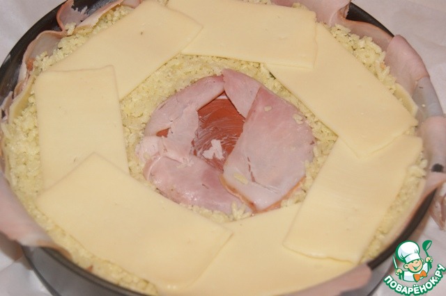 Накройте сверху кусочками сыра и свисающими краями ветчины.