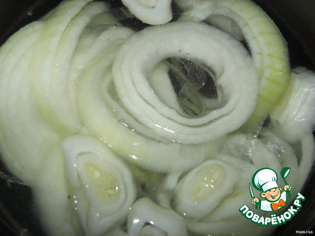 Лук очистить, нарезать кольцами, замариновать в воде, с добавлением уксуса.