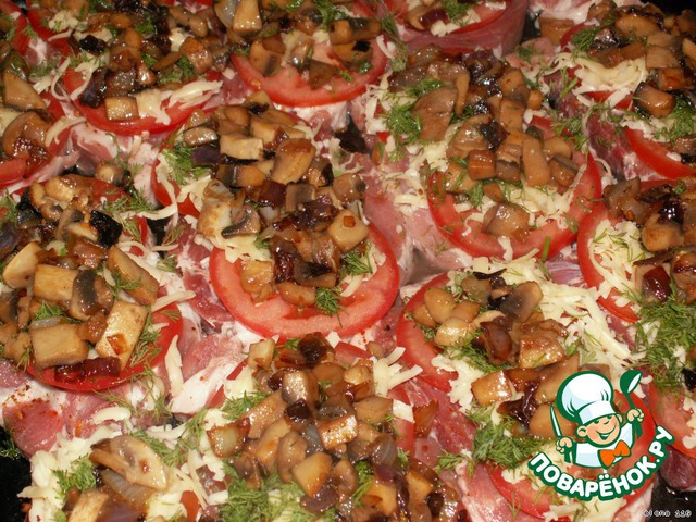 Помидоры порезать кружочками, положить по два кружка на каждый кусок мяса.