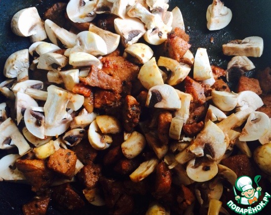 Когда мясо стало идеально мягким, убираем крышку и обжариваем на среднем огне до появления красивой румяной корочки. Добавляем порезанные грибы. Обжариваем пару минут до готовности грибов.