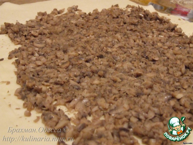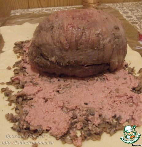 Далее укладываем наше мясо и аккуратно заворачиваем в тесто.