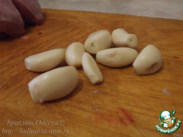 Вторую половину чеснока режем на брусочки. Прокалываем мясо и шпигуем его, равномерно, чесноком, стараясь не пропускать больших территорий.