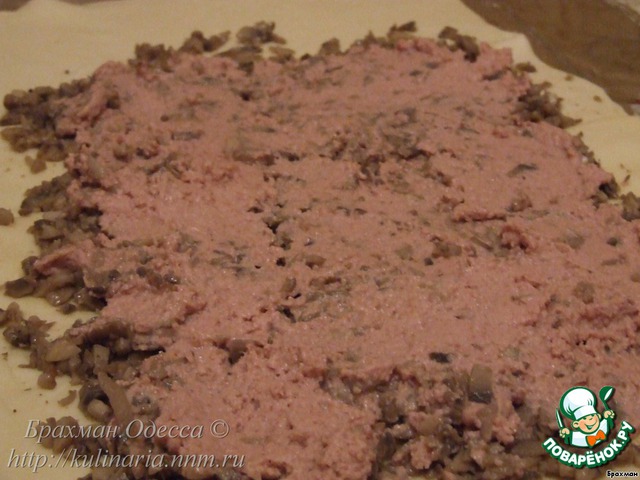На слой грибов аккуратно намазываем слой паштета. Растягиваем лопаточкой, чтобы было пошире.