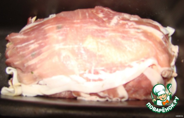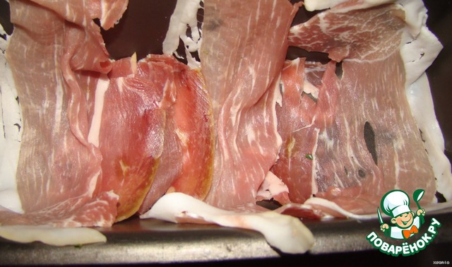 Дно формы выкладываем тонкими пластинами бекона или копченой грудинки, или вяленой ветчины.