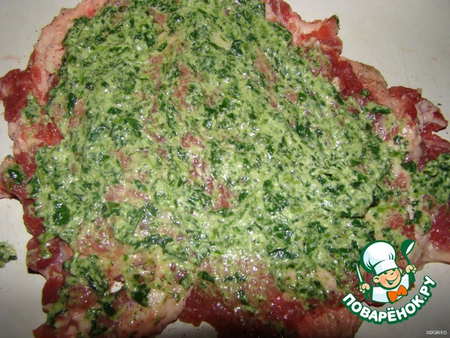 Один рулет я делала из двух эскалопов. Выкладываем отбитые куски мяса на стол.. Выкладываем на них шпинат перемешанный с сыром..