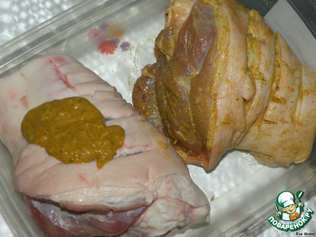 Хорошенько натираем рульки смесью, делаем несколько проколов (я порезала сеточкой шкурку, в некоторых местах поглубже, чтобы мясо хорошо пропиталось маринадом), в проколы ставим несколько веточек гвоздички (3-4) и половинок зубчиков чеснока (6-7 на каждую рульку)... ставим всю эту красоту в холодильник на ночь...