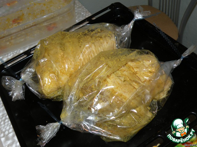 Разогреваем духовку до 150 град., рулька - это такое дело, мяско должно готовиться постепенно, так что можно и вовсе не разогревать духовку... Рулечки наши упаковываем в рукава для запекания, сделав несколько надрезов сверху пакета для выхода лишнего пара, и ставим минут на 20... Увеличиваем температуру до 170 град. и ждем 2 часа... :-X