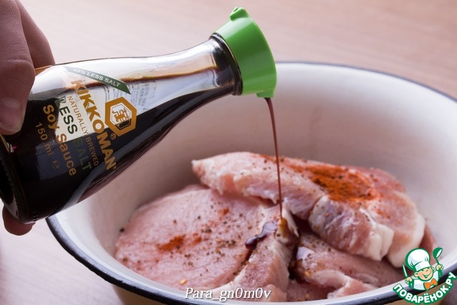 1. Медальоны промыть. Замариновать медальоны в смеси паприки, смеси перцев и соевого соуса. Тщательно перемешать и оставить хотя бы на 15-20 минут.