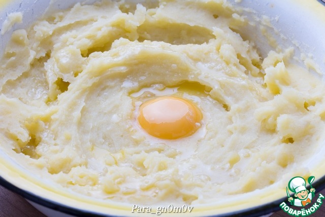 2. Картофель очистить, отварить в подсоленной воде до готовности. Размять картофель до однородности, (чтобы не было комков), добавить желток, растопленное масло, подогретые сливки, тщательно перемешать. Все ингредиенты даны приблизительно, пюре не должно быть жидким! Чем гуще пюре, тем лучше оно будет держать форму. Я чуть переборщила со сливками, и мое пюре осело сильнее, чем должно.