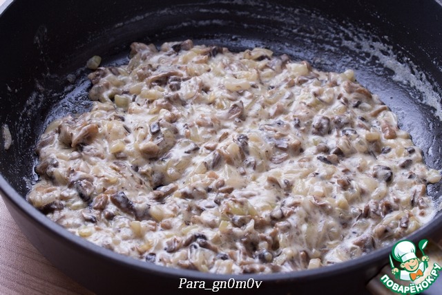 3. Пока варится картофель, грибы очистить влажной тряпочкой от грязи, мелко нарезать. Лук нарезать мелкими кубиками. Обжарить на смеси сливочного и подсолнечного масла лук и грибы. Добавить муку, подсолить, тщательно размешать, влить теплые сливки. Готовить до загустения.
