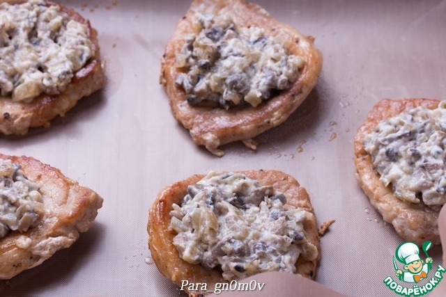 4. Медальоны чуть обсушить бумажным полотенцем и быстро обжарить с двух сторон на сильном огне до появления румяной корочки. Выложить на противень, застеленный пергаментом (у меня коврик для выпечки) медальоны с расстоянием около 7 см, сверху выложить по большой ложке грибов.