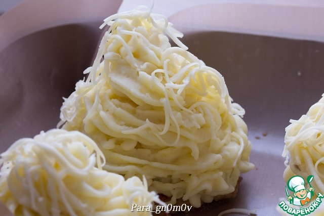 5. Духовку разогреть до 200 градусов. В это время с помощью кондитерского мешка или шприца (насадка звездочка) выложить сверху на медальоны спиралью картофельное пюре. Посыпать тертым сыром. Запекать в разогретой духовке 20 минут до небольшого зарумянивания.
