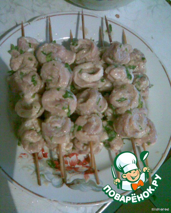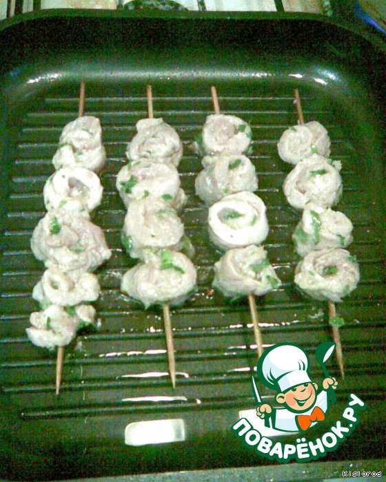 Теперь мясо достаем из маринада, слегка очищаем, скручиваем улитками и надеваем на шпажку (4 штучки на одну шпажку).