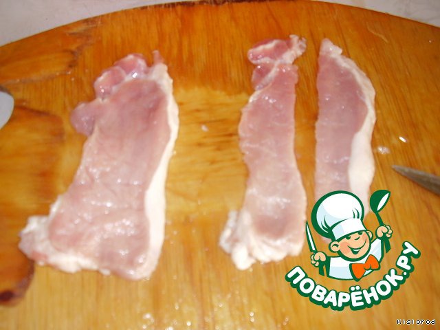 Мясо моем, обсушиваем, нарезаем на отбивные и затем каждую пополам на длинные ленты, складываем в эмалированную миску.