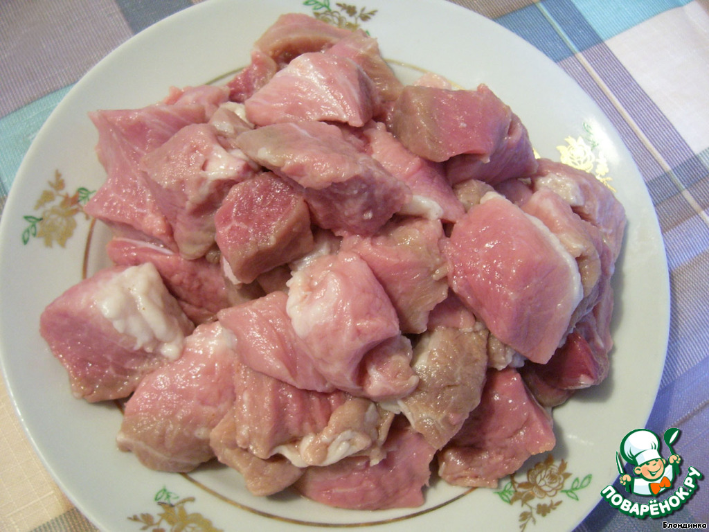 Для приготовления этого блюда нам понадобится совсем немного ингредиентов. Для начала нарезаем мясо небольшими кусочками, величиной с некрупный грецкий орех. Изначально автор рекомендовал брать шею, но я взяла заднюю ногу, то есть мясо более постное.